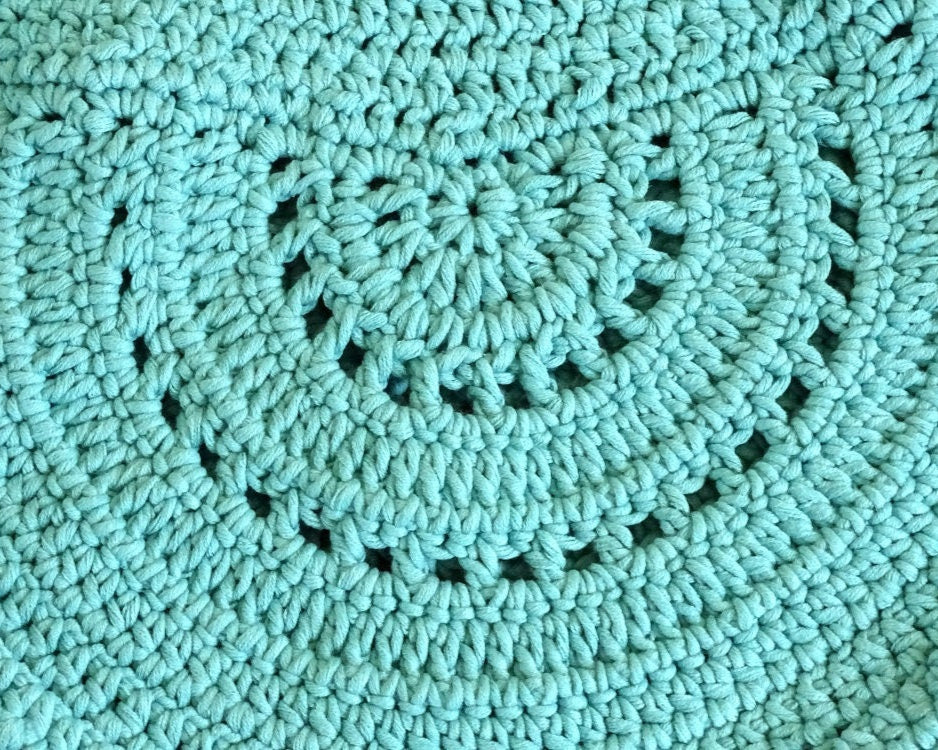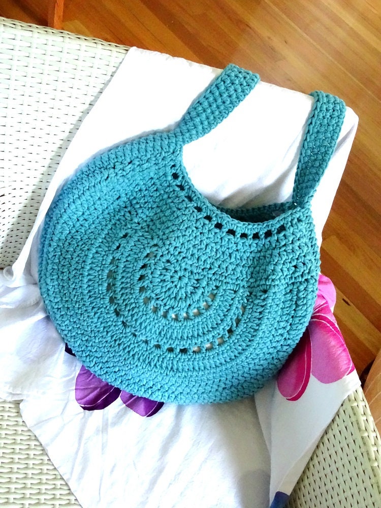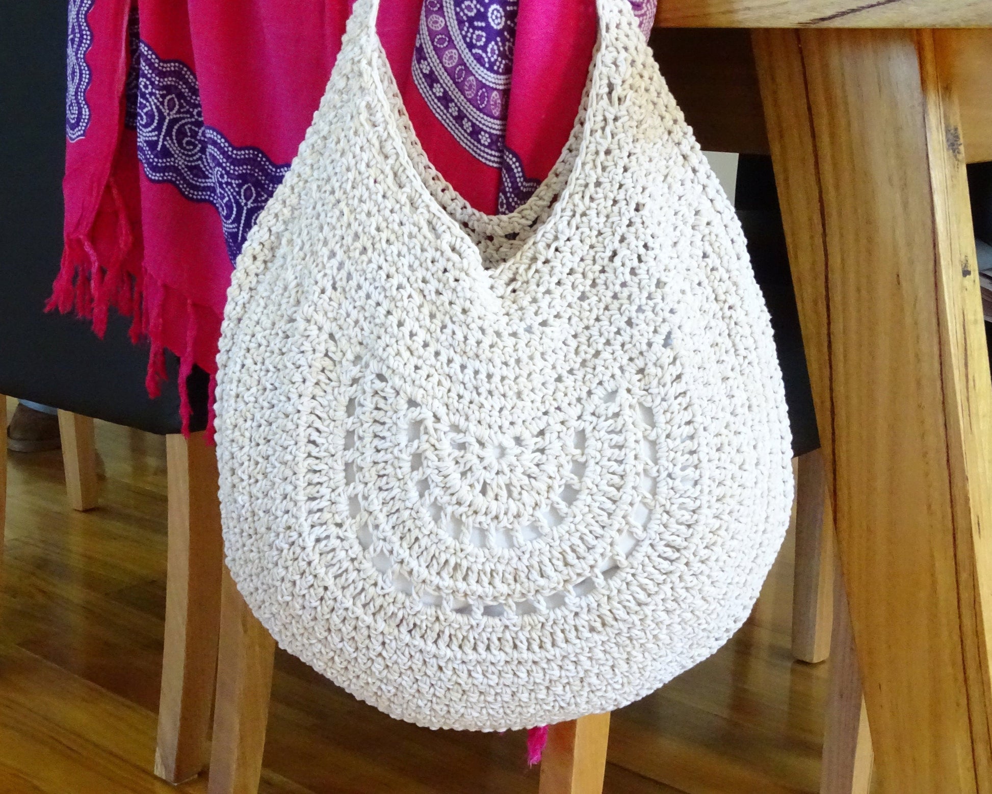 This pattern is very easy to follow with a concise step by step guide showing large images at each step. I have designed the bag in three pieces. A front and a back section, which are identical, and a long circular piece which forms the strap. The strap wraps around both sides of the bag giving it strength and durability. For this pattern I have used a 12-ply chunky cotton/acrylic, but I have also made this bag in a 10-ply cotton, and it looks just as good but will be a little smaller.