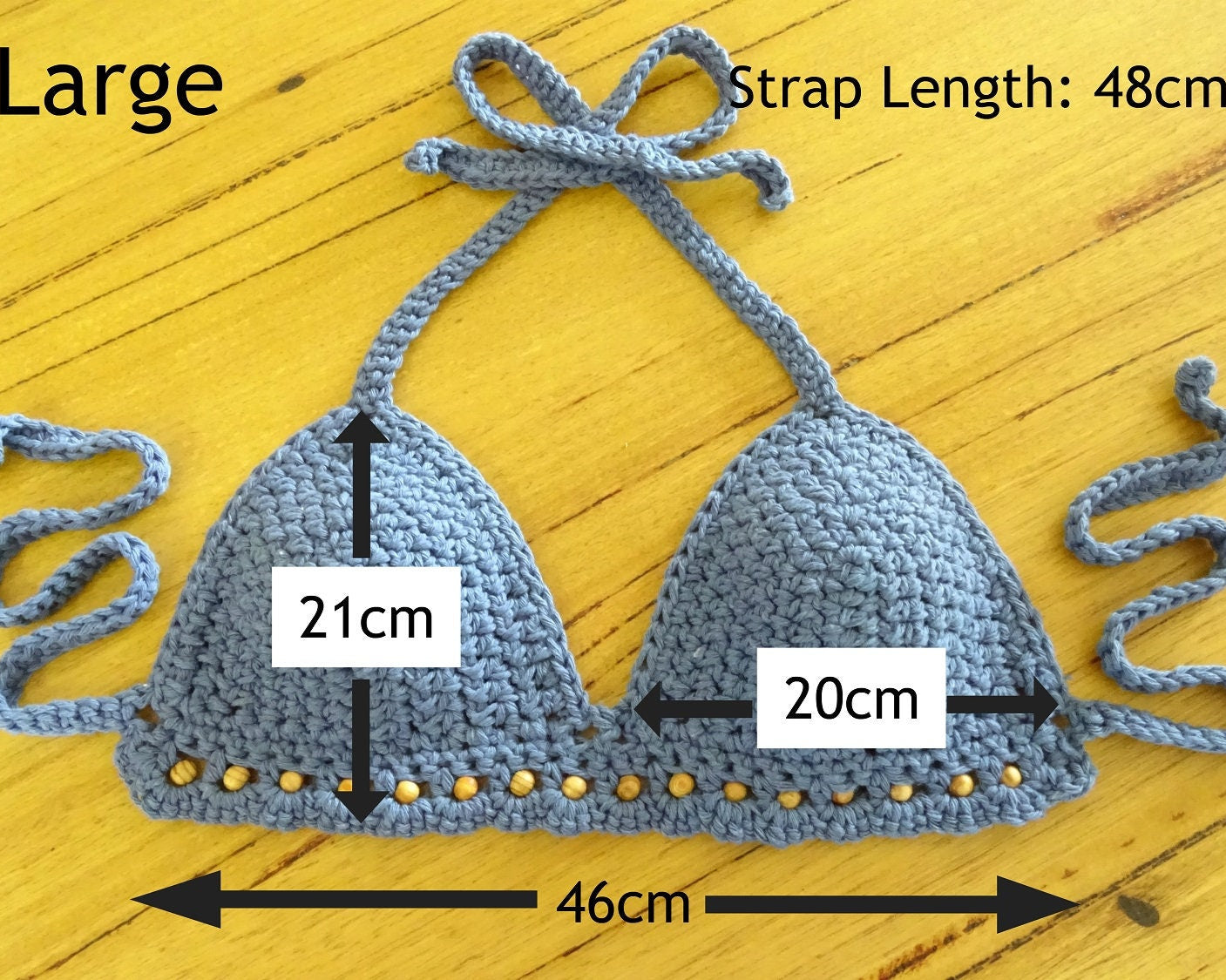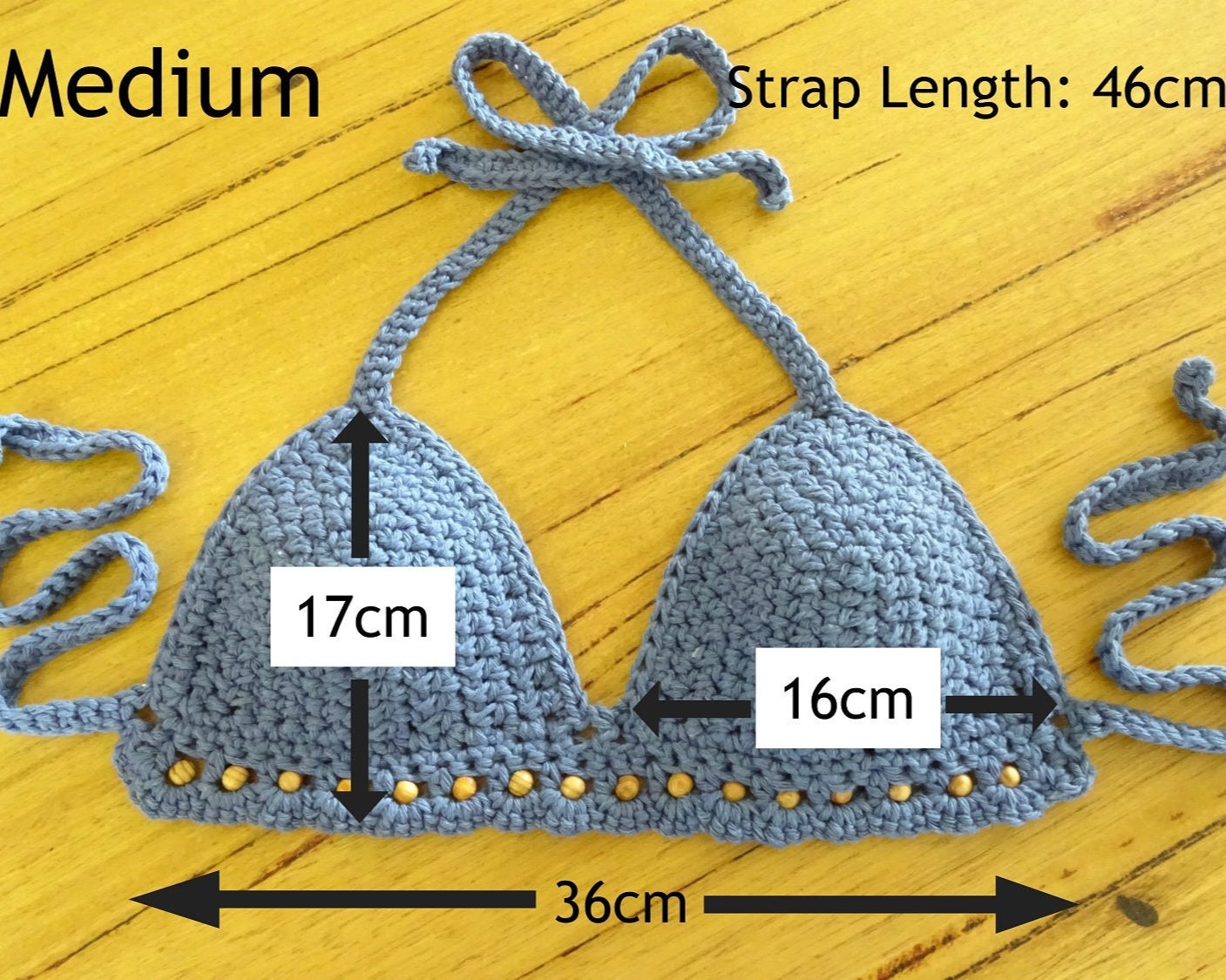 MEASUREMENTS: All measurements were taken while top was flat. Small (6-8) Bottom (measured across from the start of each strap): 28cm Across Bra Cup (measured from bottom of scalloping to triangle top): 14cm Bra Cup (measured across): 12cm Strap Length: 38cm Medium (10-12) Bottom (measured across from the start of each strap): 36cm Across Bra Cup (measured from bottom of scalloping to triangle top): 18cm Bra Cup (measured across): 16cm Strap Length: 46cm Large (12-14) Bottom (measured across from the start of each strap): 44cm Across Bra Cup (measured from bottom of scalloping to triangle top): 22cm Bra Cup (measured across): 20cm Strap Length: 48cm.