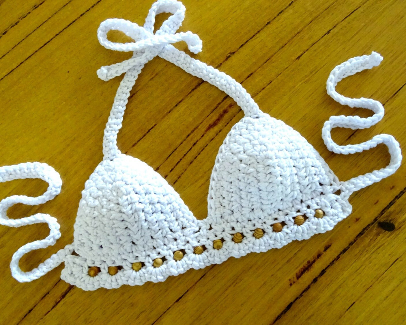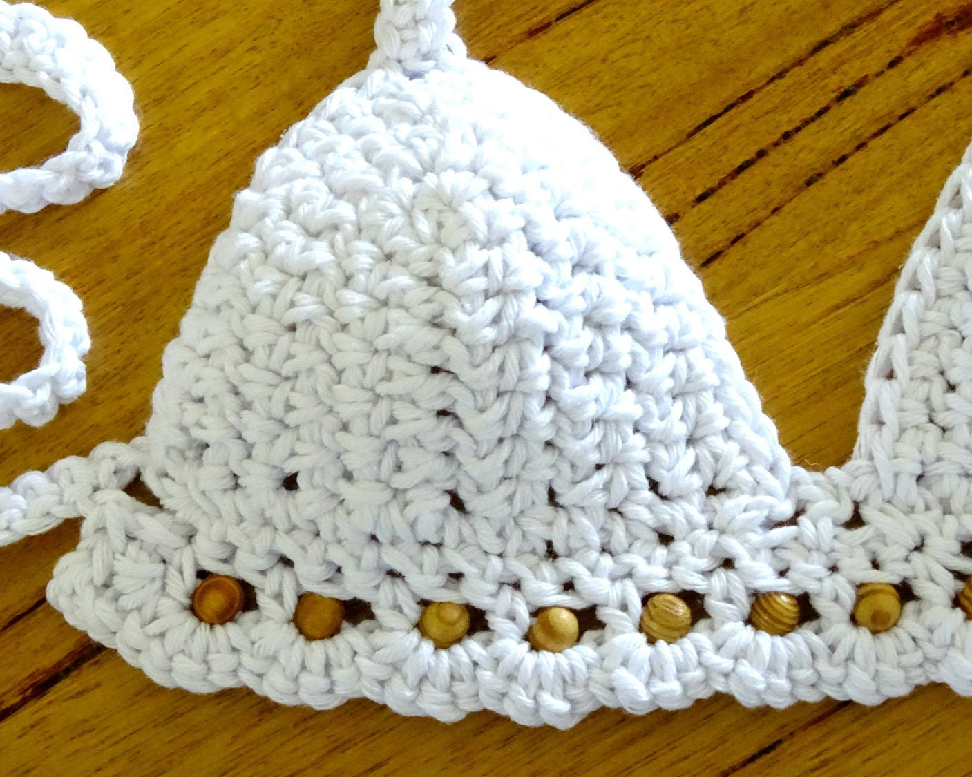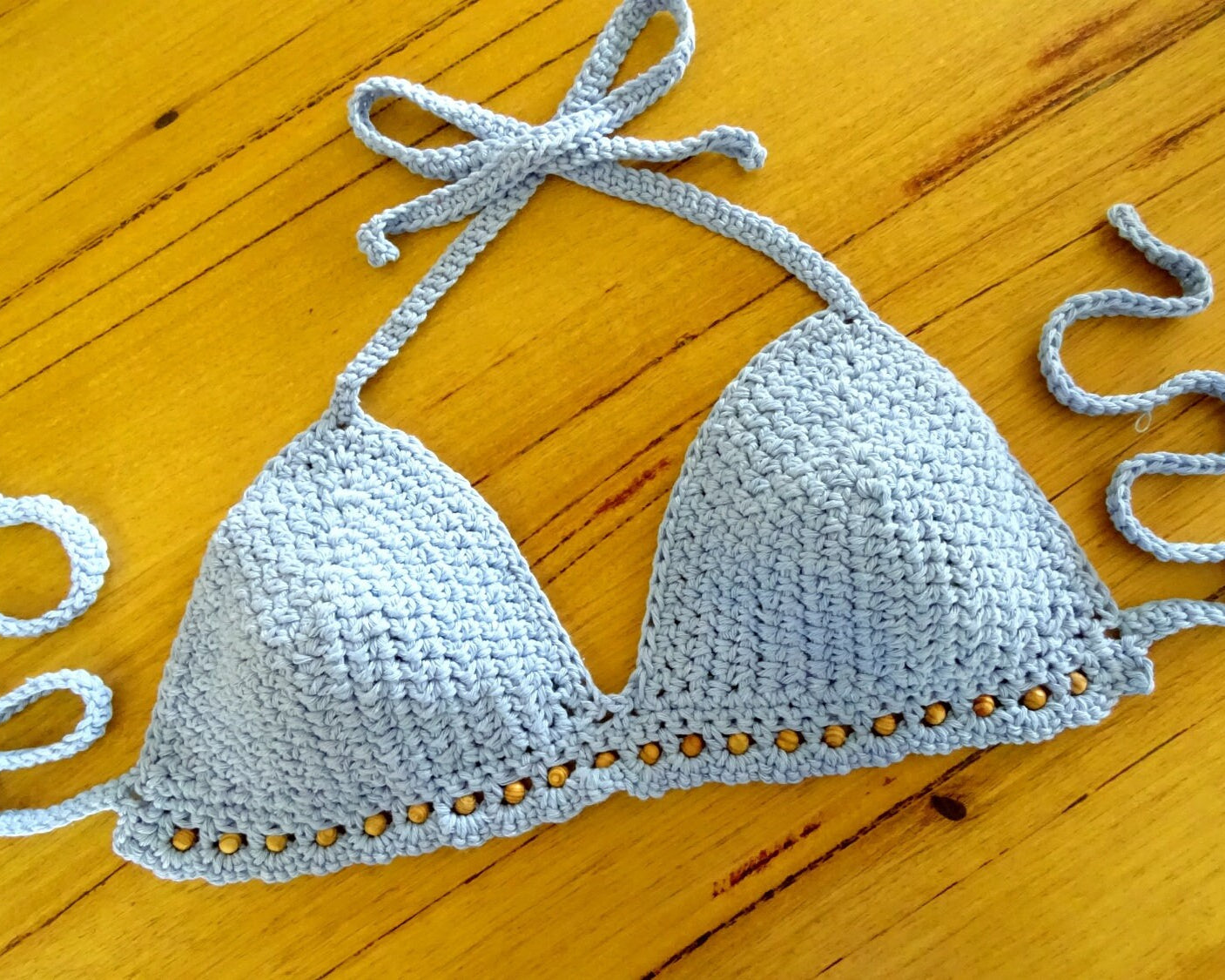 This gorgeous original handmade design crochet cotton halter bralette top will look great on the beach, at your next festival or just a top you can throw on and wear every day. The pattern has instructions for 3 basic ladies' sizes of small (size: 6-8) with an approximate cup size of A-B, medium (size: 10-12) with an approximate cup size of C-D and large (size: 14-16) with an approximate cup size of D-DD. There is some flexibility with these sizes as the top will stretch and move with you. To see the sizing measurements, please refer to the image gallery above. The straps tie and will fit any size. I have made this halter bikini top in a 10-ply cotton yarn.