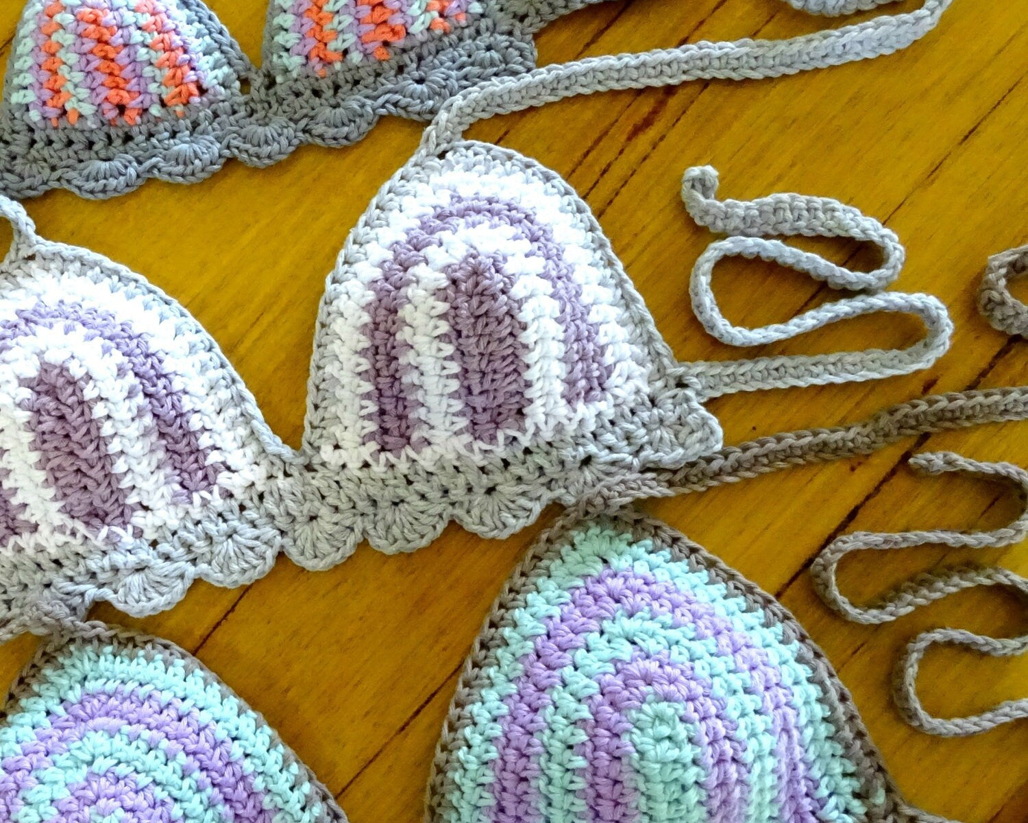 I have designed this easy striped crochet bikini halter top pattern with basic crochet stitches using US terminology of chains, single crochet and half double crochets so it is not complicated but still has an overall effect of looking fabulous. For UK crocheters there is a stitch conversion for you. I have also included a handy tutorial on working with stripes and changing colours for a neater finish.