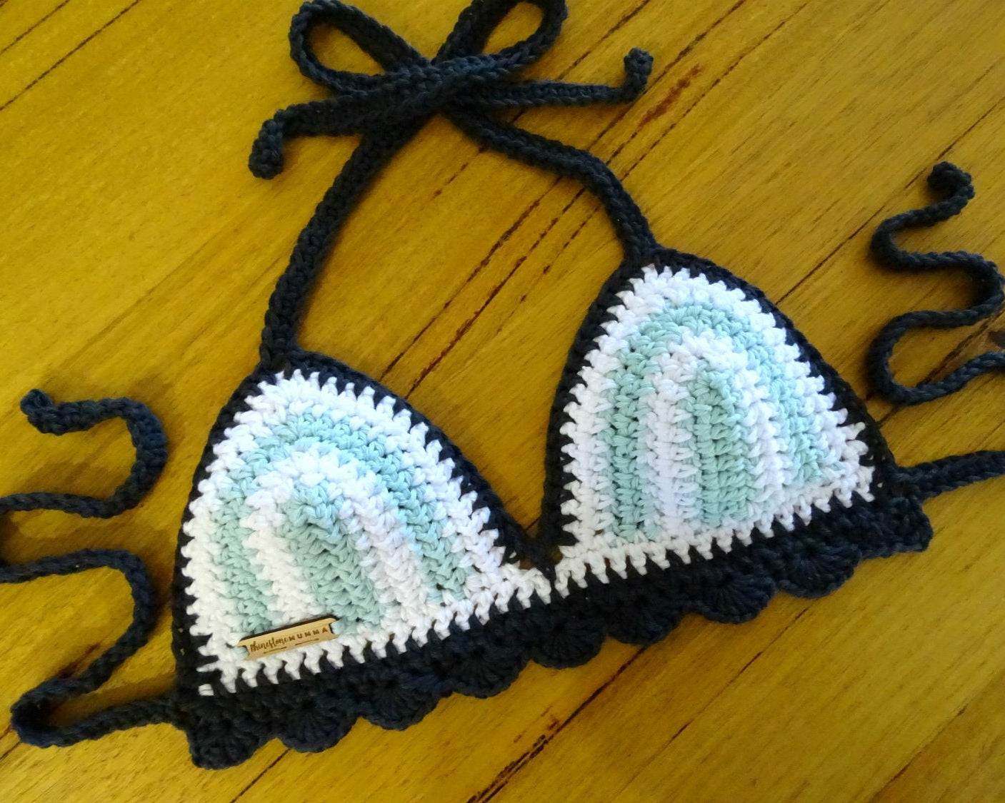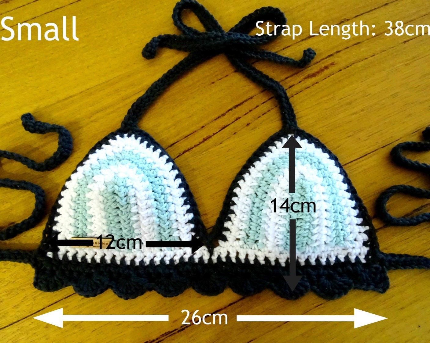 All measurements were taken while top was flat. Small (6-8) Bottom (measured across from the start of each strap): 26cm Across Bra Cup (measured from bottom of scalloping to triangle top): 14cm Bra Cup (measured across): 12cm Strap Length: 38cm Medium (10-12) Bottom (measured across from the start of each strap): 34cm Across Bra Cup (measured from bottom of scalloping to triangle top): 18cm Bra Cup (measured across): 15cm Strap Length: 45cm Large (12-14) Bottom (measured across from the start of each strap): 40cm Across Bra Cup (measured from bottom of scalloping to triangle top): 22cm Bra Cup (measured across): 16cm Strap Length: 48cmnemumma