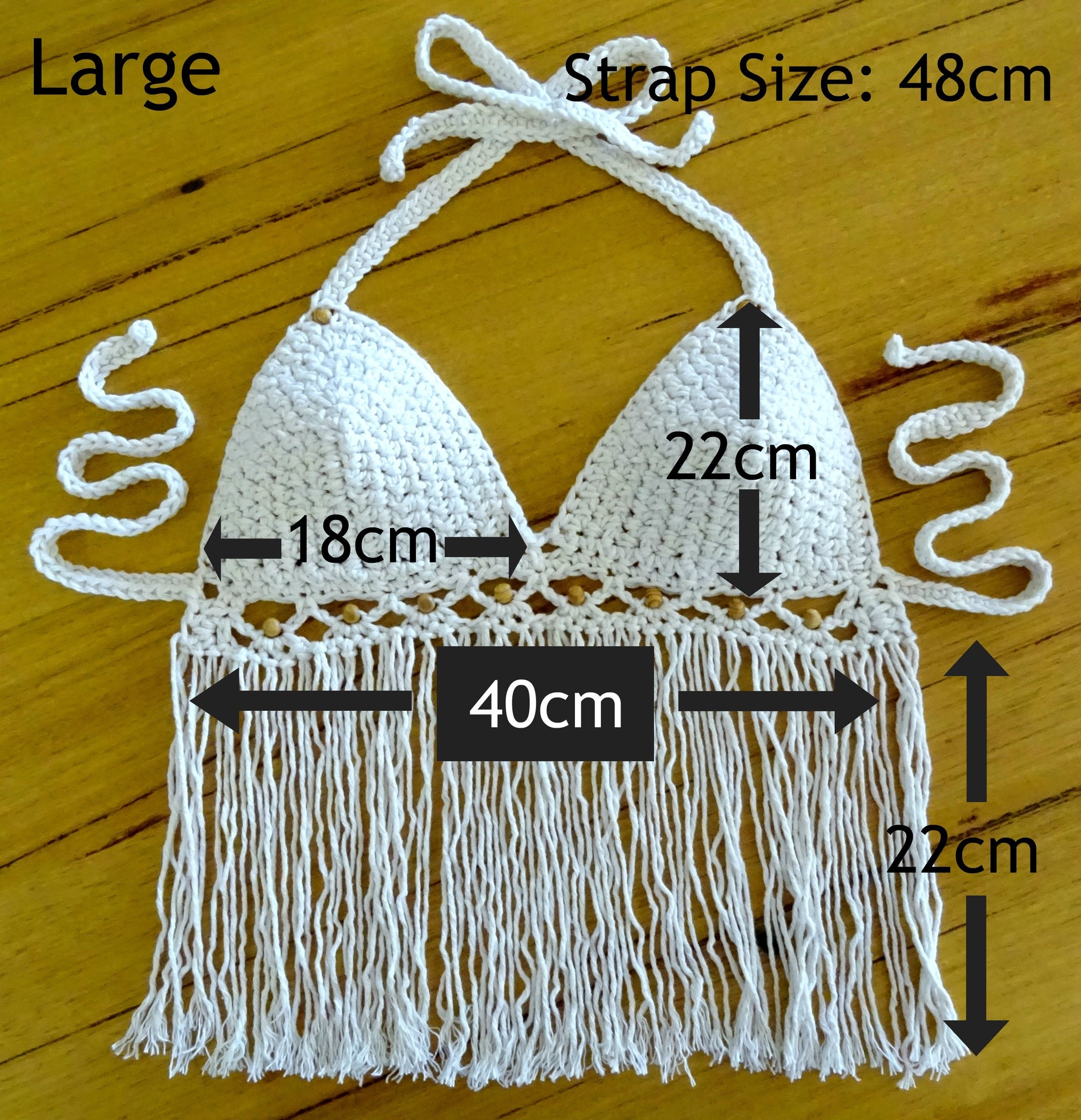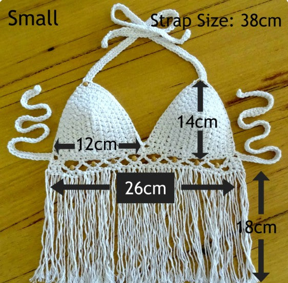MEASUREMENTS: All measurements were taken while top was flat. Small (6-8) Bottom (measured across from the start of each strap): 26cm Across Bra Cup (measured from bottom to top): 14cm Bra Cup (measured across): 12cm Tassel Length: 18cm (can be adjusted) Strap Length: 38cm Medium (10-12) Bottom (measured across from the start of each strap): 34cm Across Bra Cup (measured bottom to top): 18cm Bra Cup (measured across): 16cm Tassel Length: 20cm (can be adjusted) Strap Length: 45cm Large (12-14) Bottom (measured across from the start of each strap): 40cm Across Bra Cup (measured bottom to top): 22cm Bra Cup (measured across): 18cm Tassel Length: 22cm (can be adjusted) Strap Length: 48cm.