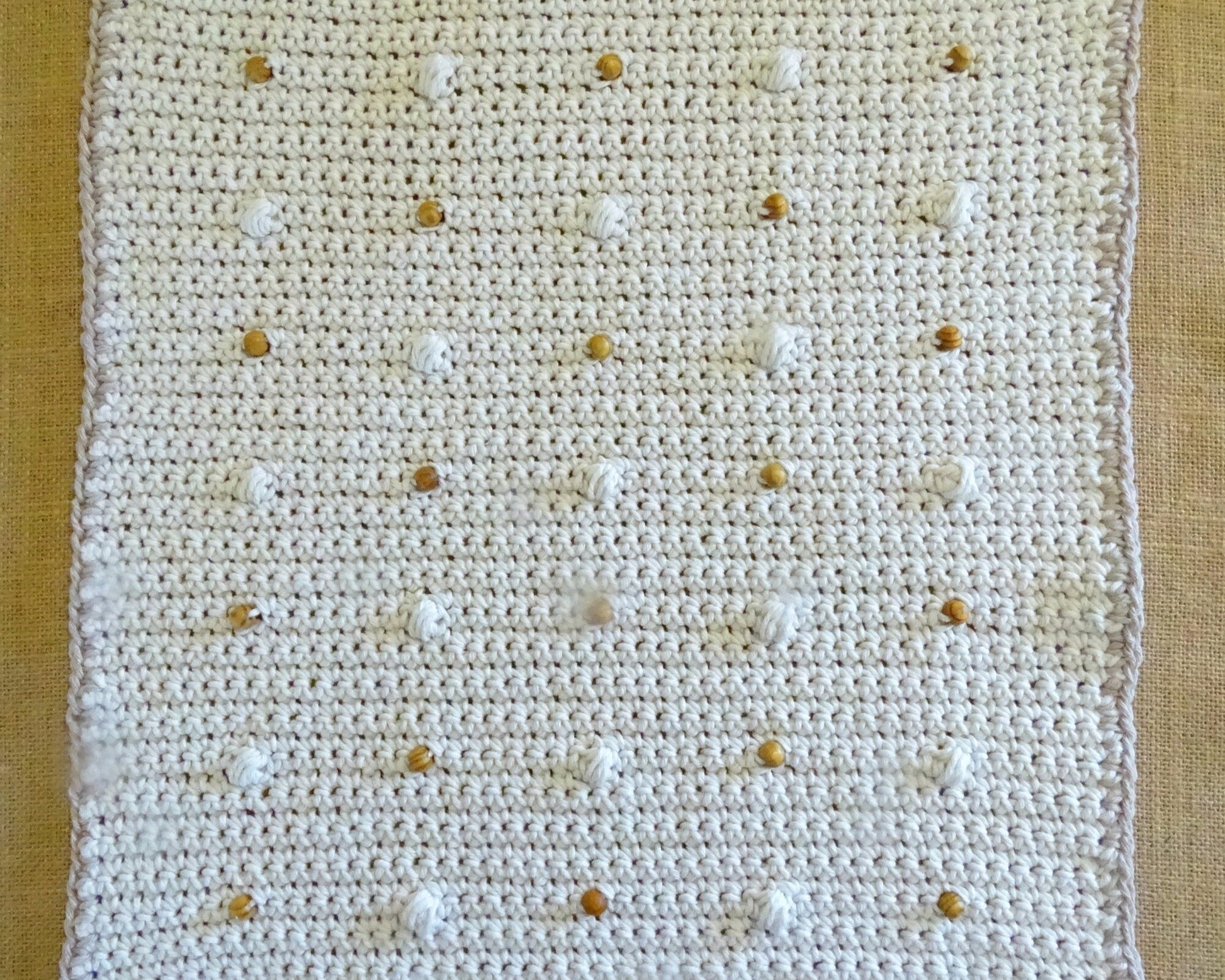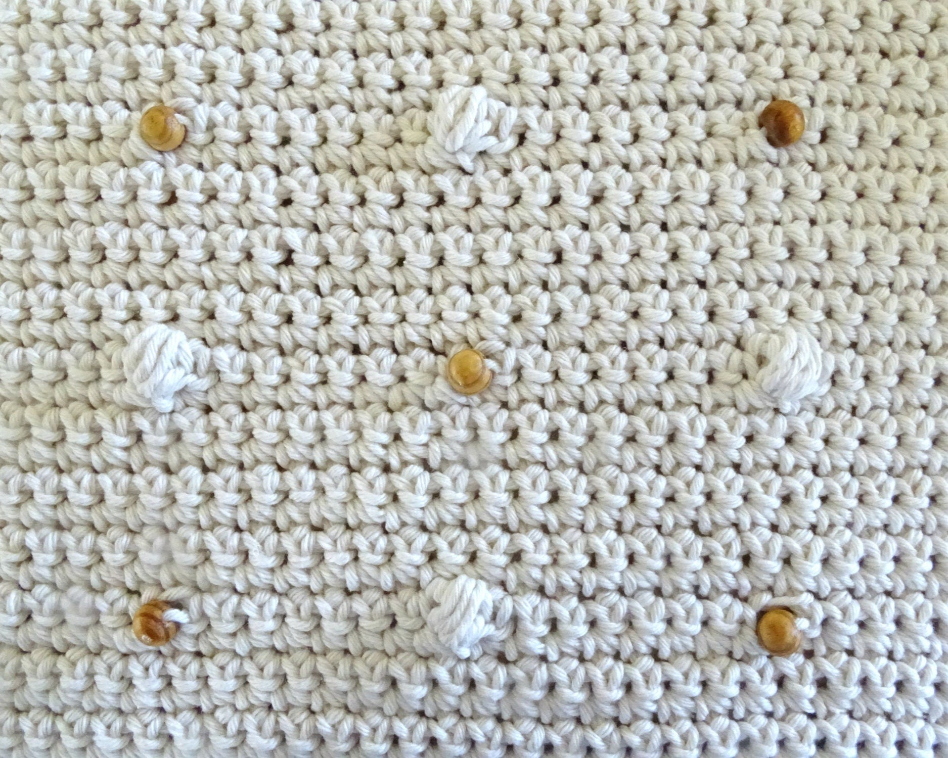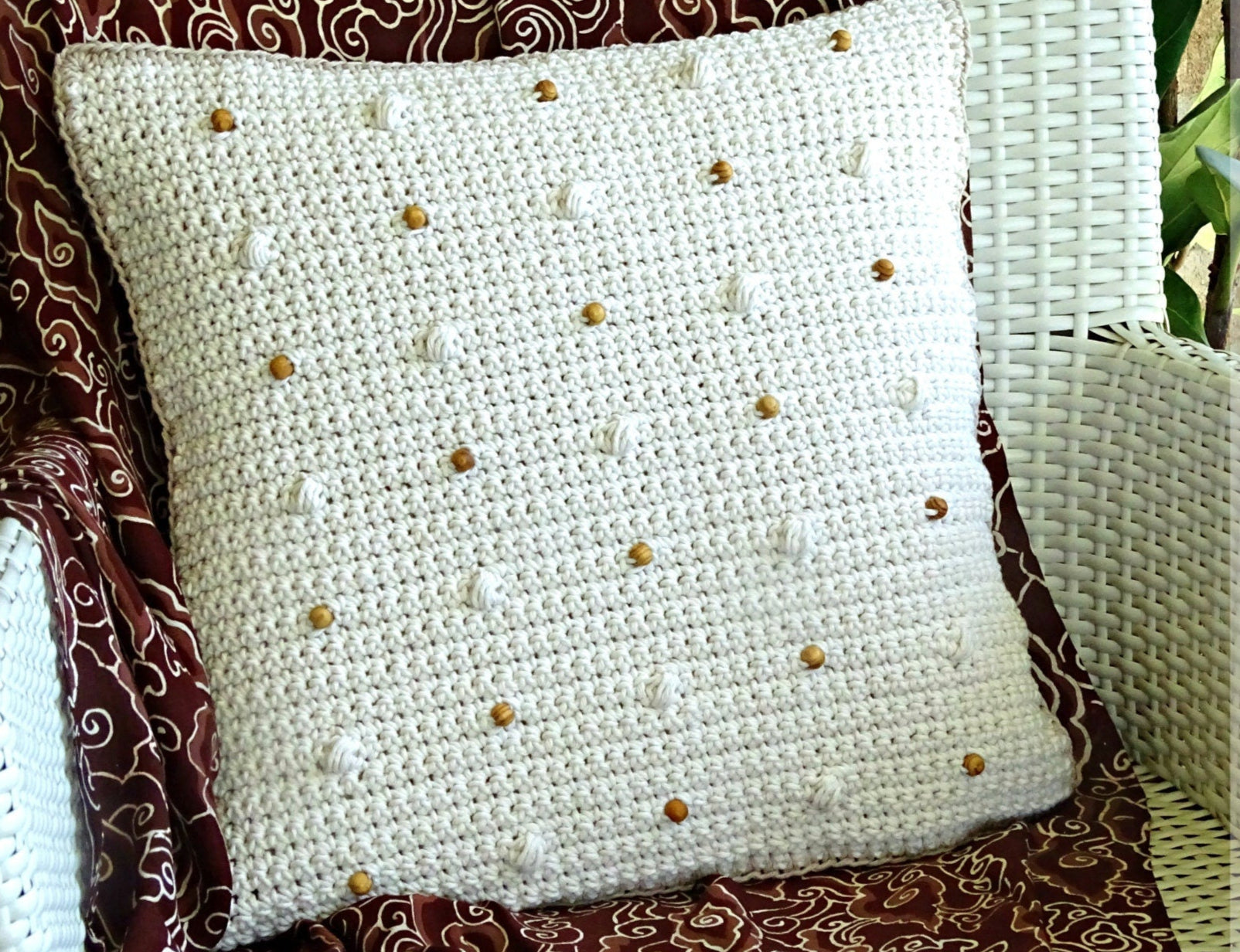All my patterns are written in my own unique style giving you step by step instructions with large images at each stage so you can track your progress visually as well. This pattern is 13 pages in length. The beaded puff stitch pattern design is featured on the front. The back of the cushion is plain and closes with 3 natural wooden buttons. I have finished this cushion cover in a 10 ply eco cotton with a stitch tension of 15 stitches x 19 rows (10 x 10 cm sq). Any 10 ply or chunky cotton or cotton blend yarn would work well for this project. You could also use an 8-ply yarn but keep in mind the finished size will be smaller than the sizing indicated below so you would need a smaller cushion insert.